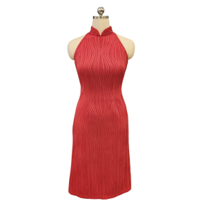 Salmon Red Pleated Lycra Aline Cut-in Cocktail Cheongsam