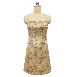 Gold Brocade Cocktail Cheongsam with Cut-in Halter Detachable mesh Collar