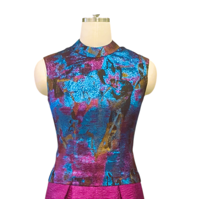 Blue and Pink Metallic Brocade Mandarin Round Collar Cheongsam Top